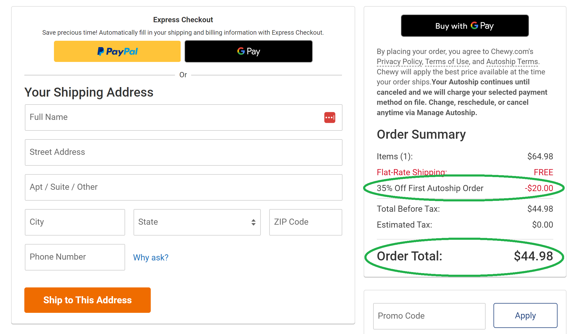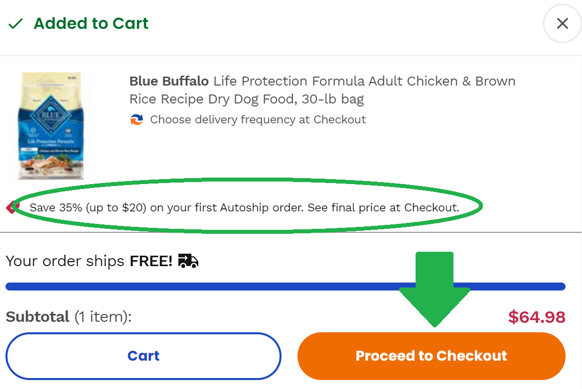 Select the pet supplies you need and add them to your cart through Start Autoship option. This is key to securing the 35% discount.