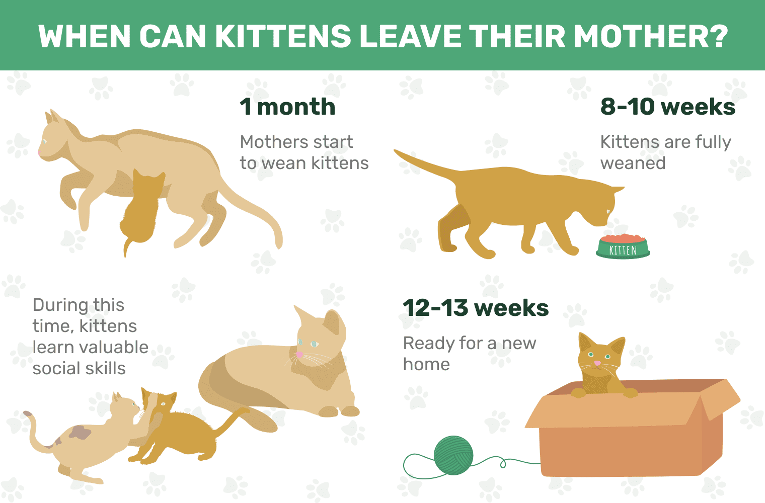 By 12 weeks, most kittens will be ready for rehoming and separation from their mother. However, some kittens benefit from being left with their mother for an additional 2 weeks.