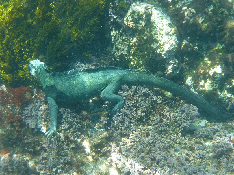 In addition, some species, like the marine iguana of the Galapagos Islands, can stay underwater for much longer and will dive to eat algae. Iguanas don’t breathe underwater but can hold their breath for long periods.