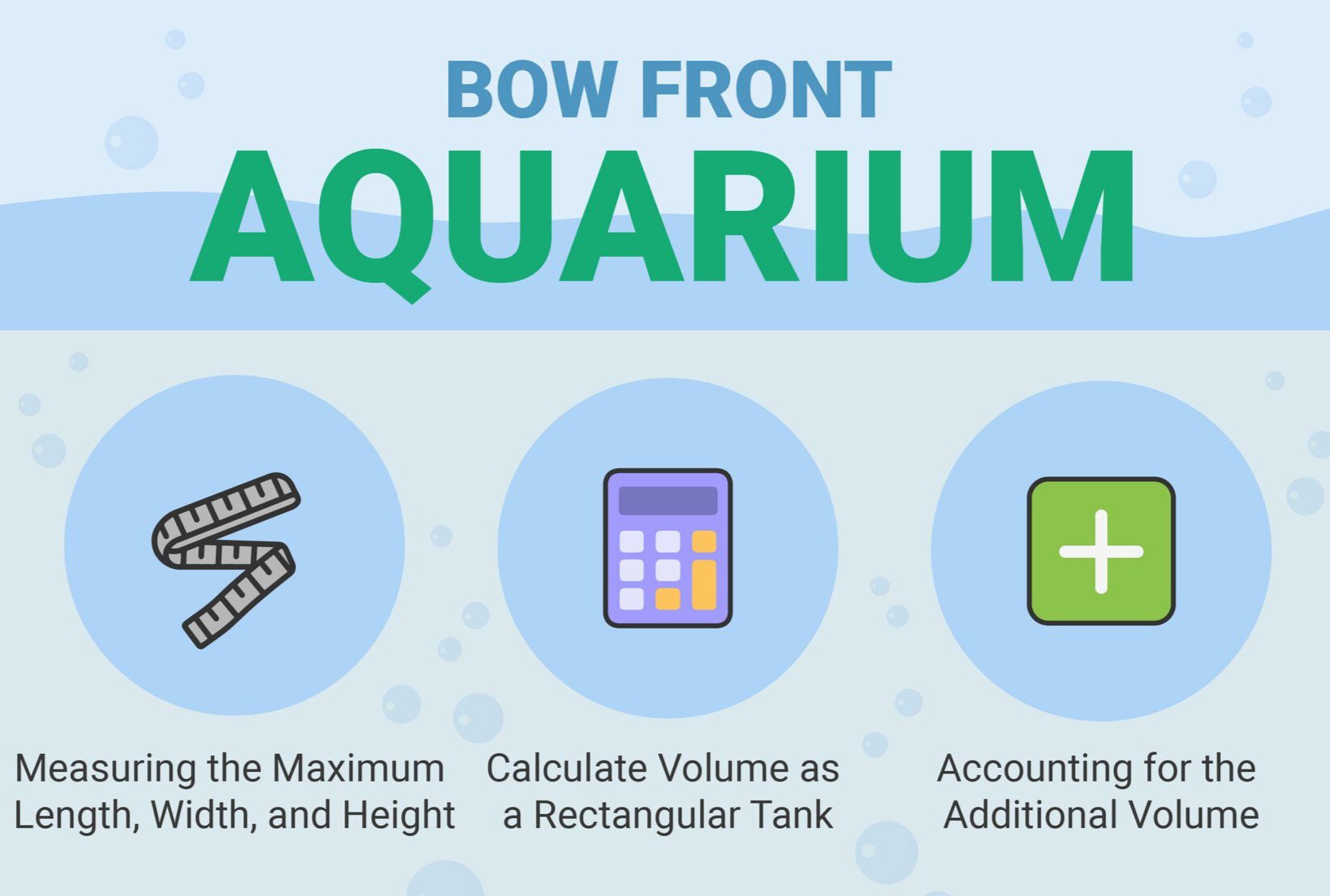 - Accounting for the Additional Volume: As the front of the aquarium is curved, it holds more water than a standard rectangular aquarium with the same base measurements. To account for this, it is generally a good idea to add about 15% more to the volume calculated in the previous step.