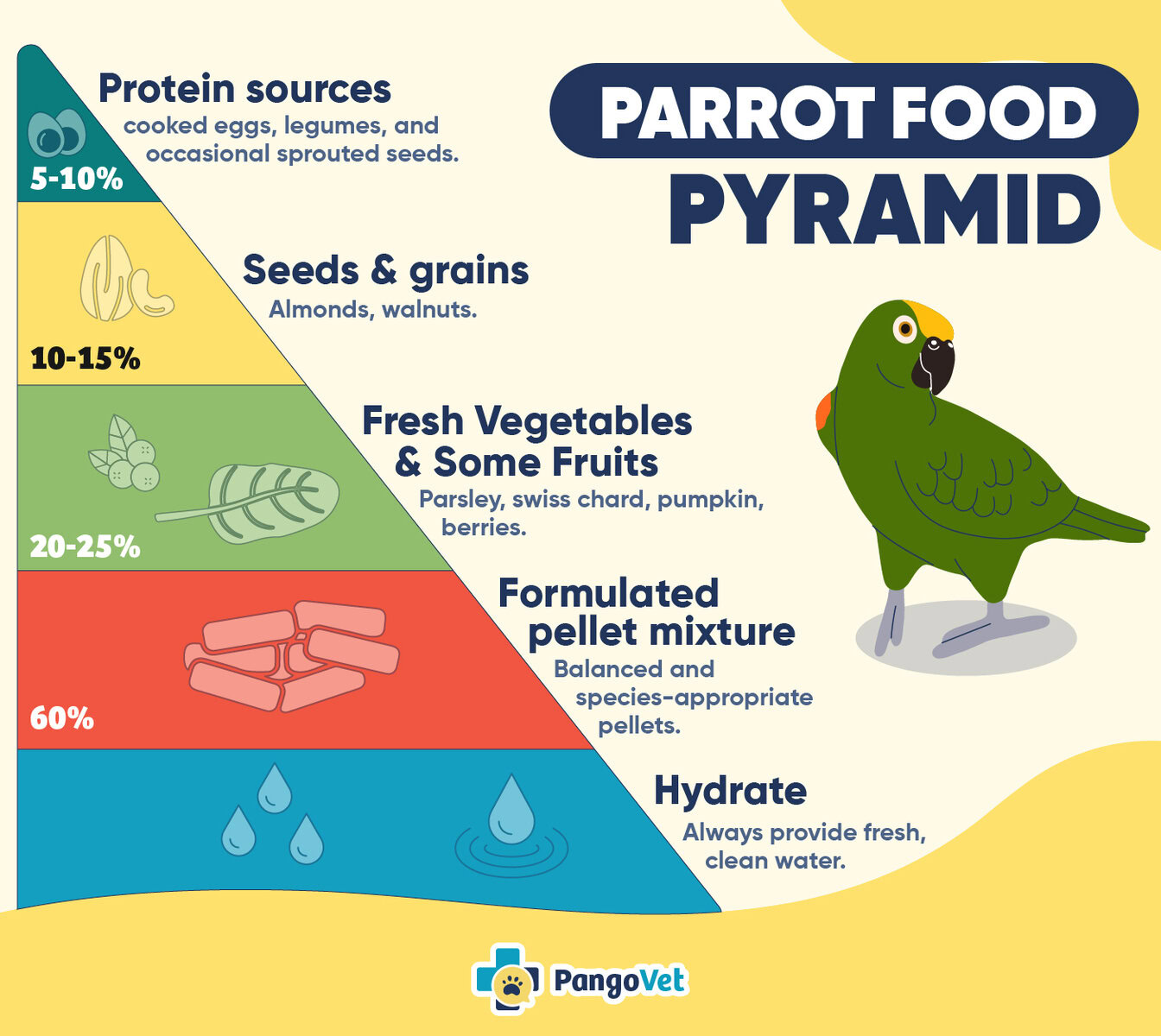 Most parrots are omnivorous, meaning they eat plant matter and sometimes insects or worms. Each species will have their own specialized dietary favorites and portion recommendations.