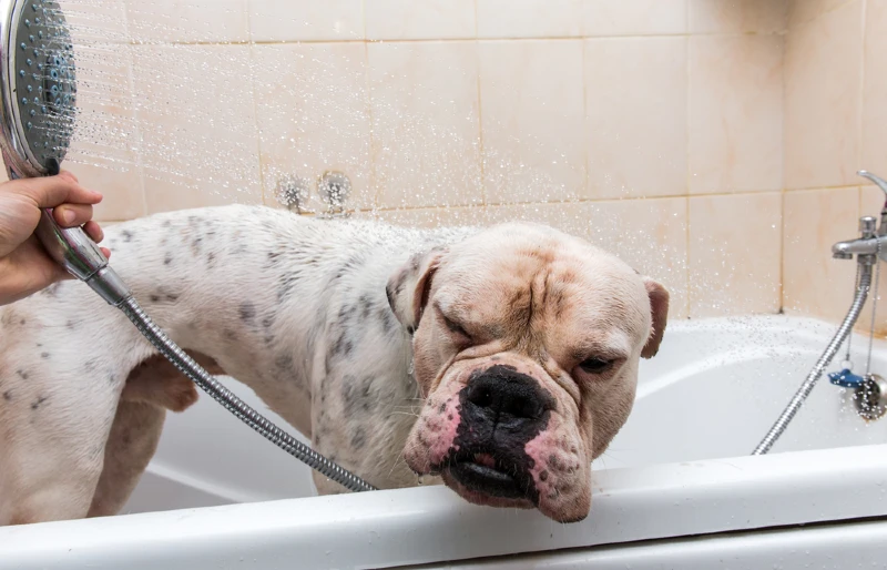 Keep the water temperature in mind and try to keep it comfortable for them, not too hot or too cold. Avoid splashing water directly into the dog’s face or any other sensitive areas.
