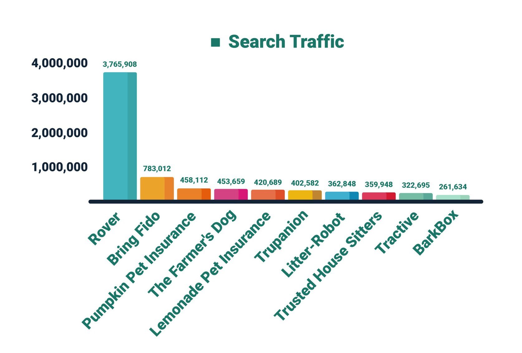 Rover, our #1 brand, had a search traffic metric of 3,765,908, meaning the company had almost 4 million visits to its website from searches. Compare that to #10 on our list, Pretty Litter, which only had 214,833 search visits. There’s a world of difference there, and of course, the more people whose eyeballs land on a site, the better.