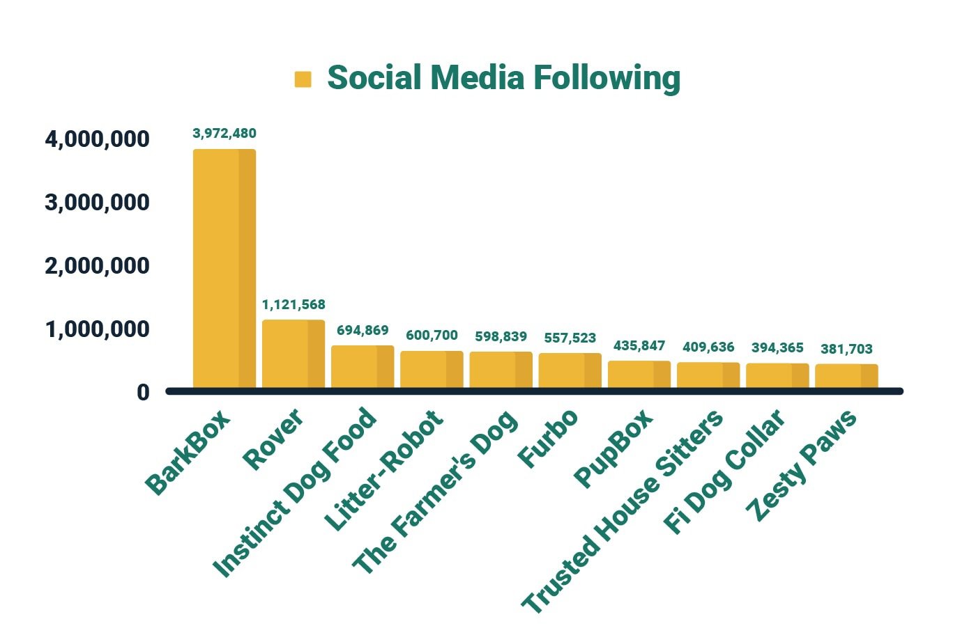 Plus, social media helps brands build a sense of community and makes it easy to stay in touch with their followers. Our third-ranking brand, Trupanion, had 219,084 followers across four social platforms, while our eighth-ranking brand, Bring Fido, only had 93,724 followers across the same platforms. Again, there’s a relatively significant difference in these metrics.