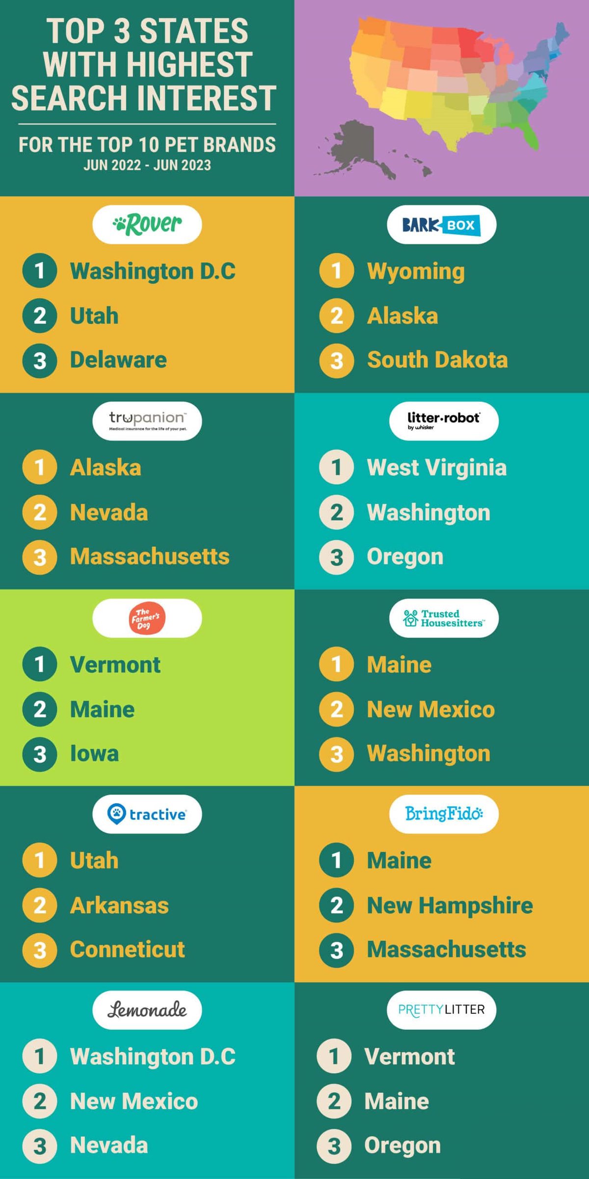 We were also curious about which US states had the highest search interest over a period of 12 months for each particular brand in the top 30. So, we decided to award the top 10 most popular US pet brands, each with a unique title that boasts its most significant achievement as a pet brand!