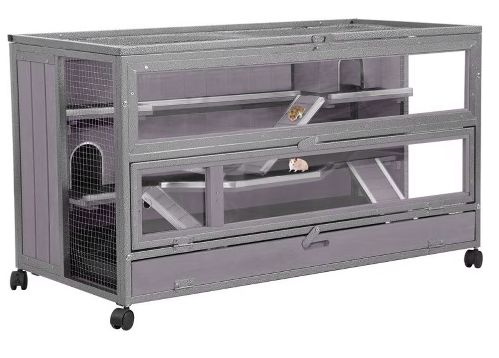 Aivituvin Anti-chewing Wooden Hamster Cage is a sturdy setup that provides a nice habitat for all your rat babies. There are two platforms for your pets to scurry around on, which are accessible via three ramps. You can access the interior through the wire-net lid or the front “window” portion.