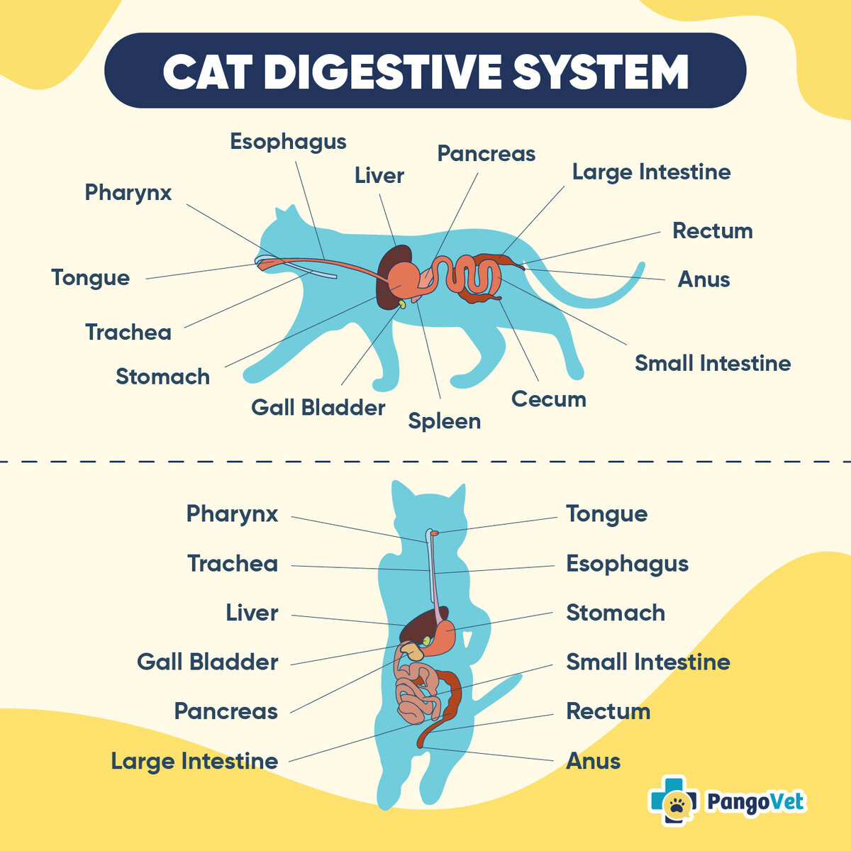 Learn more »Digestion is the process of breaking down ingested food and turning it into nutrients, which the cat’s body uses for energy, growth, and cell repair. All these processes are essential for survival. The digestion process also involves eliminating waste by creating and excreting feces. Additionally, digestion plays a vital role in helping to maintain the proper balance of fluid and electrolytes (salts) in the cat’s body.