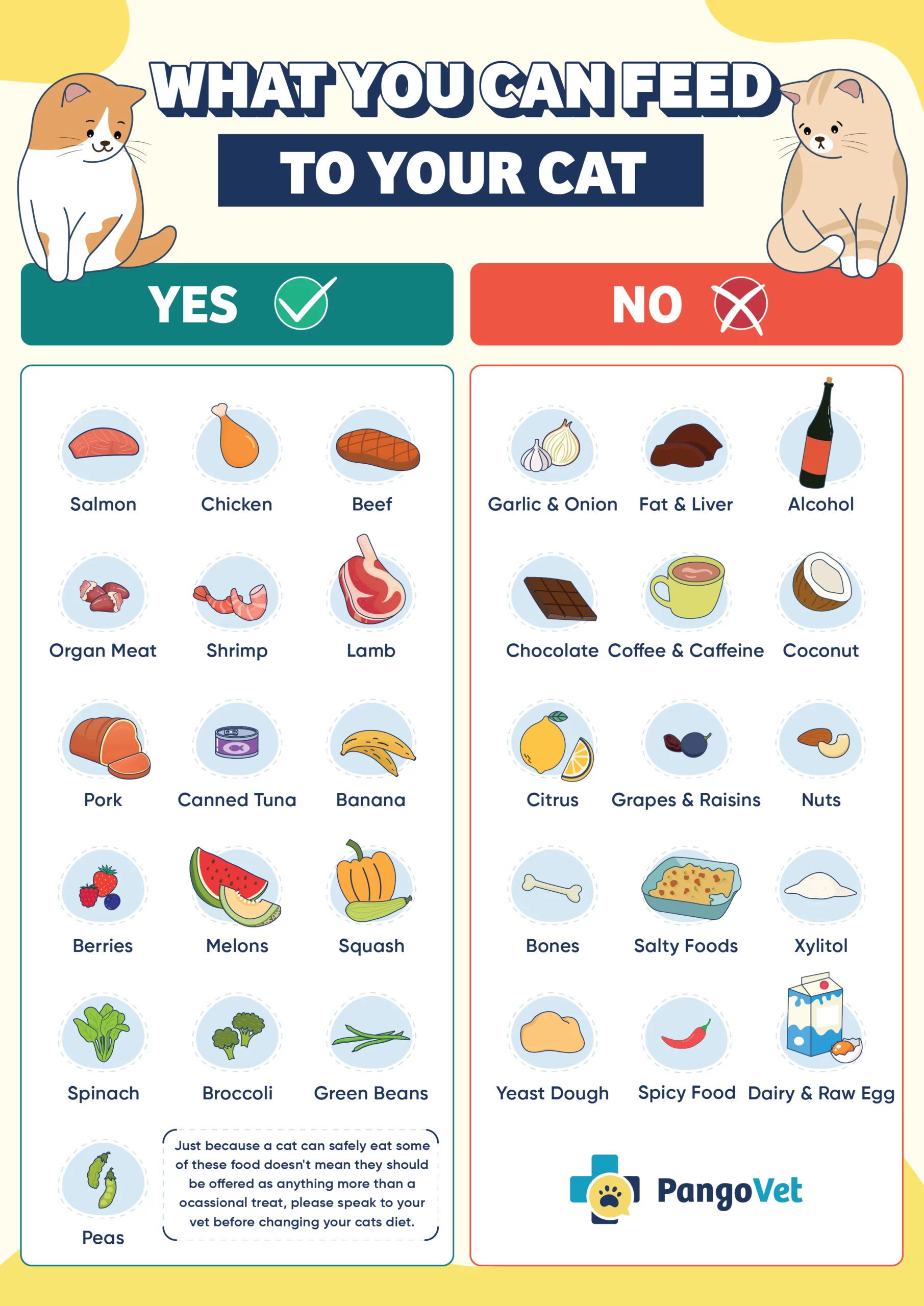 Never feed a cat any of the following foods in any capacity. If you find your cat has eaten any food on this list, please contact your veterinarian immediately or reach out to the Pet Poison Helpline.