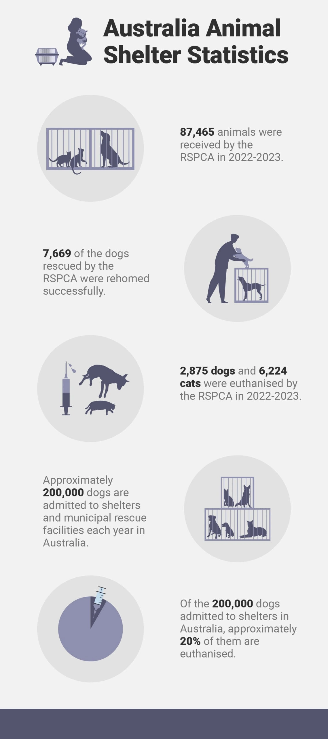 - A total of 2,875 dogs and 6,224 cats were euthanised by the RSPCA in 2022–2023.